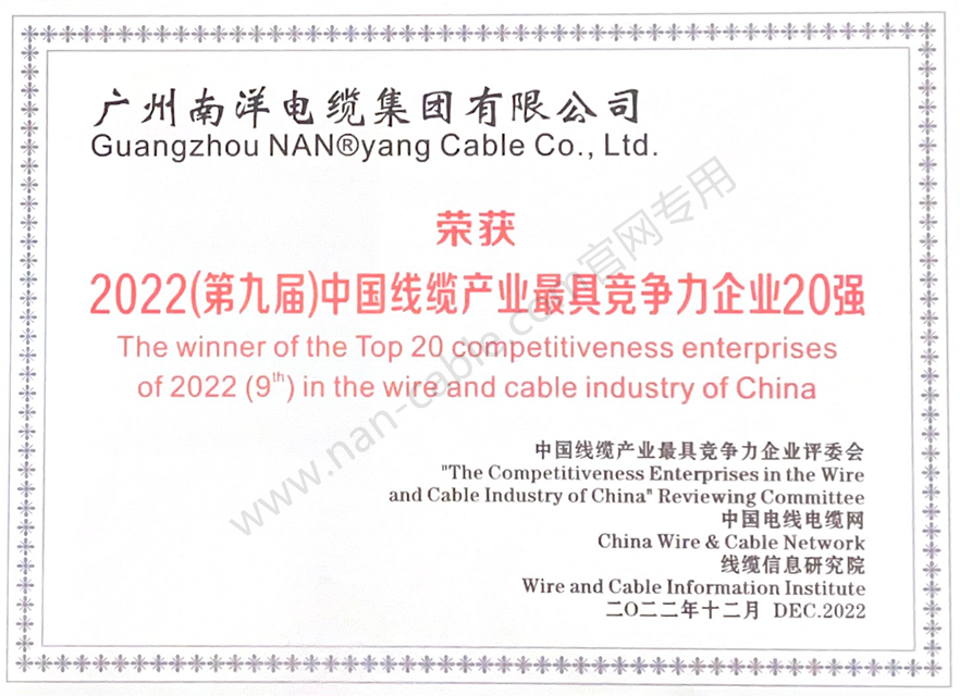 • 2022年度中國(guó)線纜行業(yè)最具競(jìng)爭(zhēng)力企業(yè)20強(qiáng)證書
