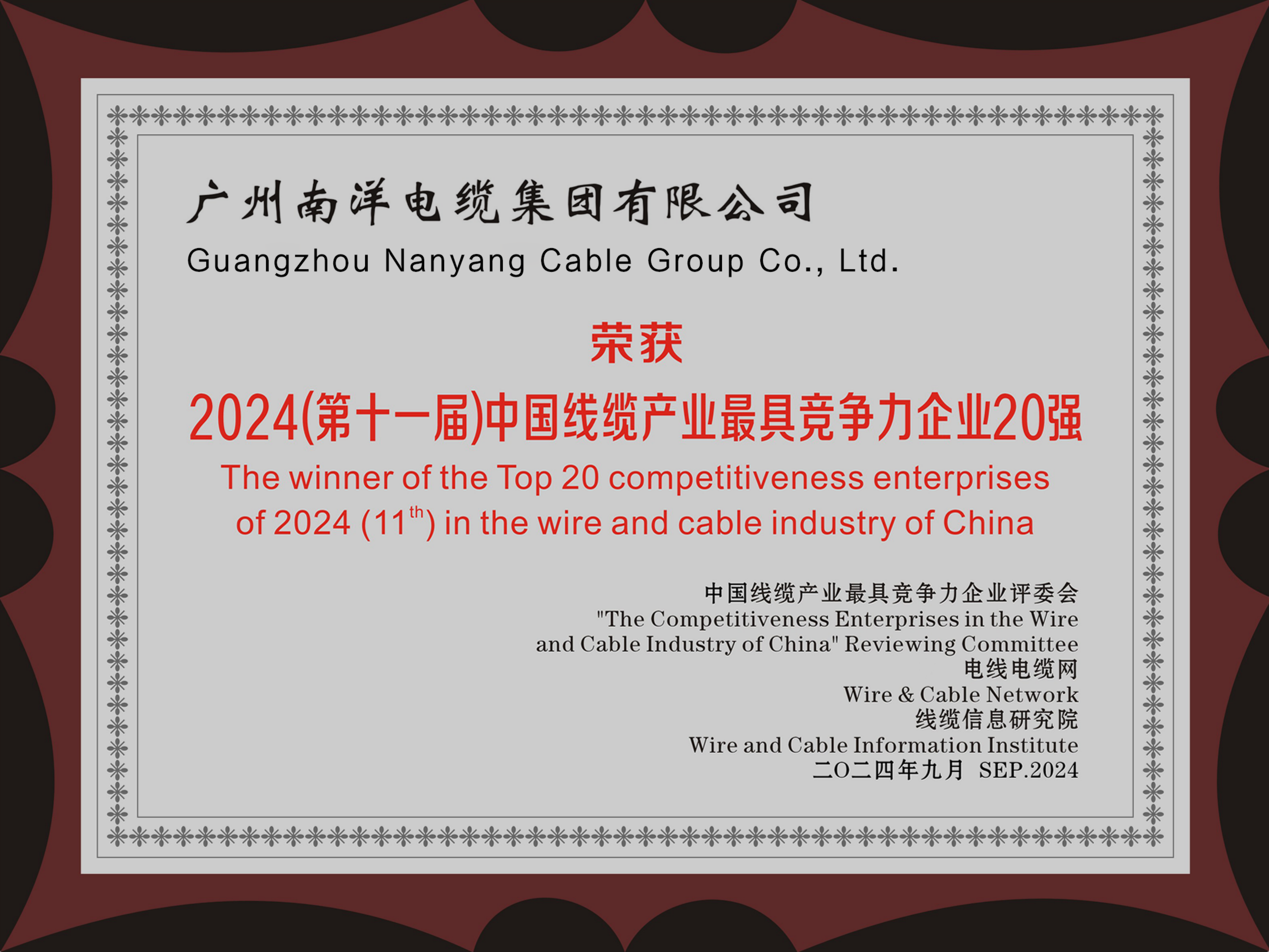 • 2024年度中國(guó)線纜行業(yè)最具競(jìng)爭(zhēng)力企業(yè)20強(qiáng)證書